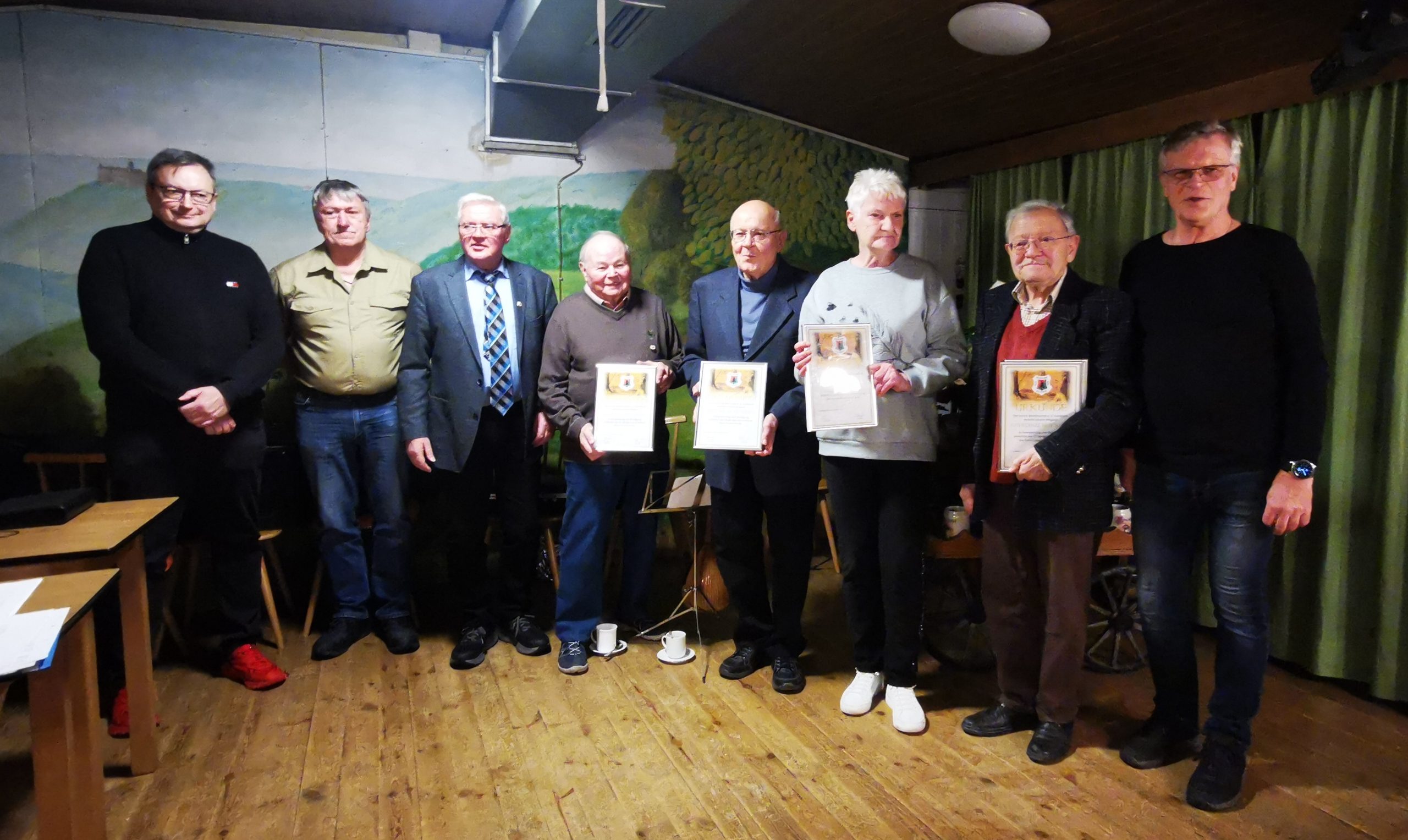 Schriftführer Jörn Hortung, Hauptkassier Günter Limmer, Vorstand Gerhard Ködel, Helmuth Obermaier ( 60-jährige Mitgliedschaft ), Frieder Eichenberg ( 50-jährige Mitgliedschaft ), Hannelore Hahrenburg ( stellvertretend für Babette Keltsch, 40-jährige Mitgliedschaft ), Günter Brückner ( stellvertretend für seine Töchter Christine Porst und Constanze Brückner, 15-jährige Mitgliedchaft ), stellvertretender Vorstand Stefan Opel